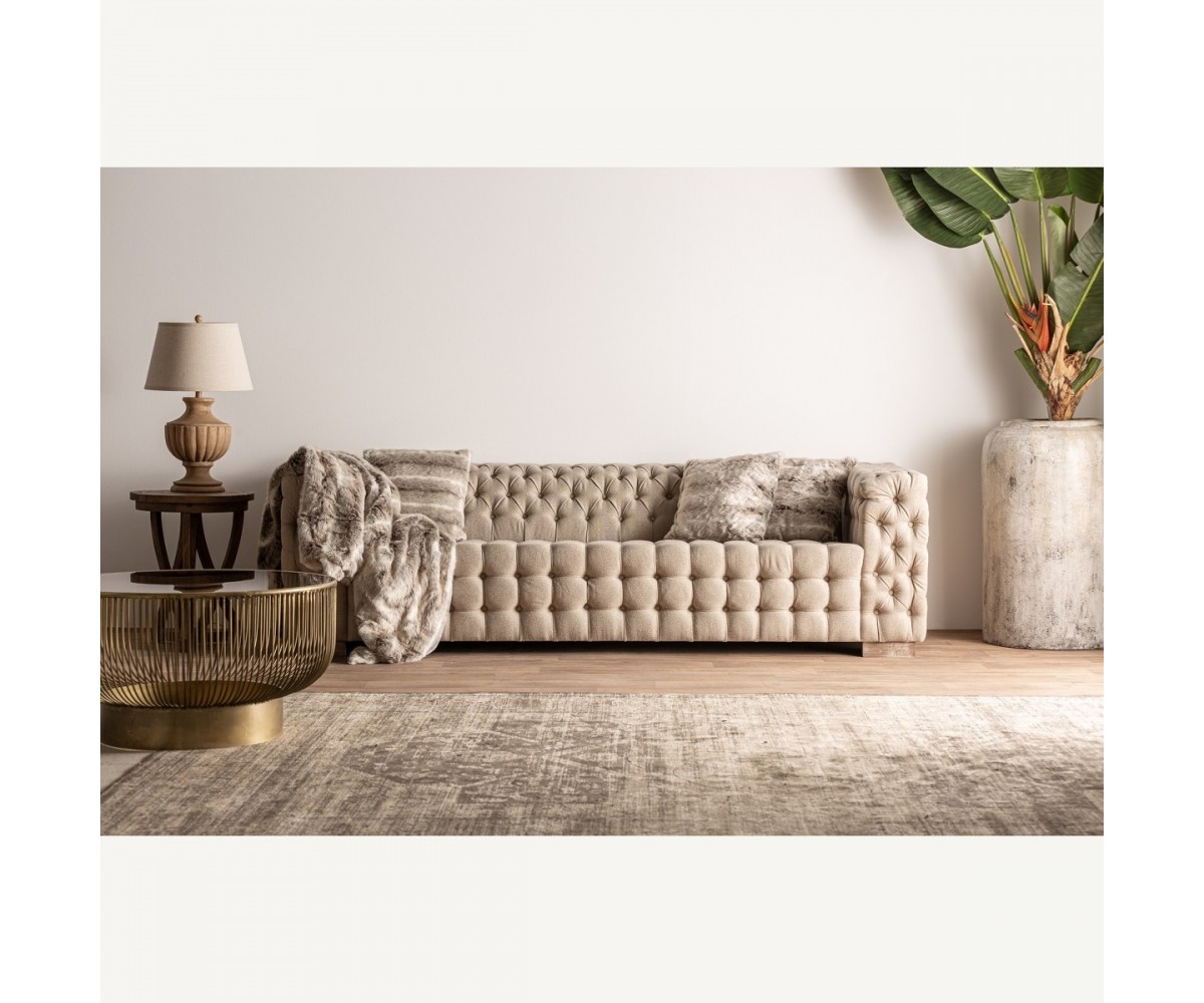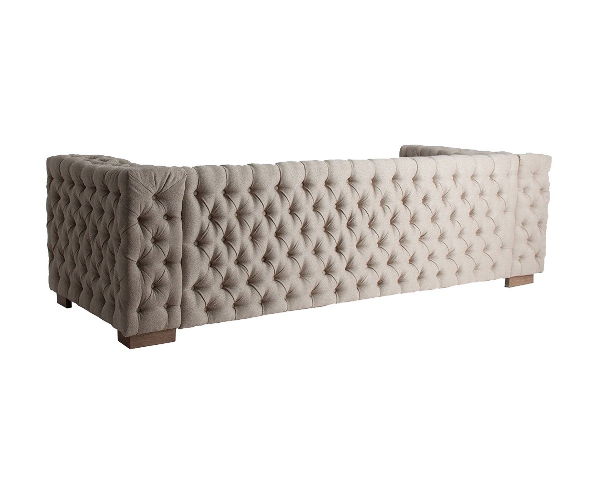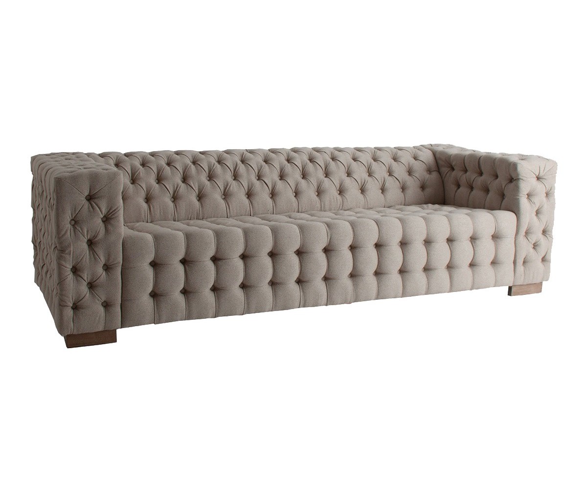 Sofá inspirado en un diseño de Paola Navone. Estructura de madera de abeto macizo de una pieza, relleno de polipropileno indeformable. Tapizado en tejido color crema. Producto desmontable. Patas en madera de nogal.