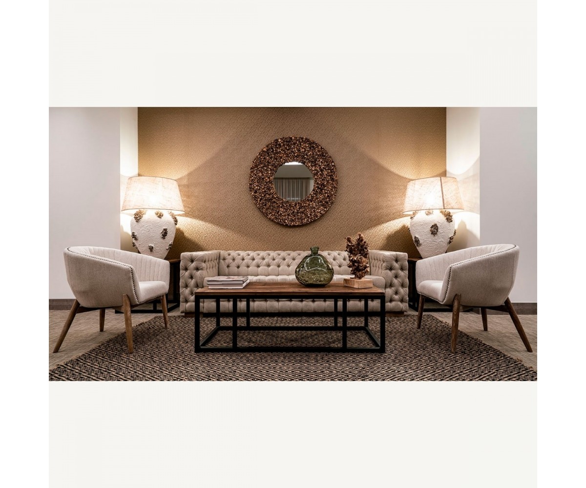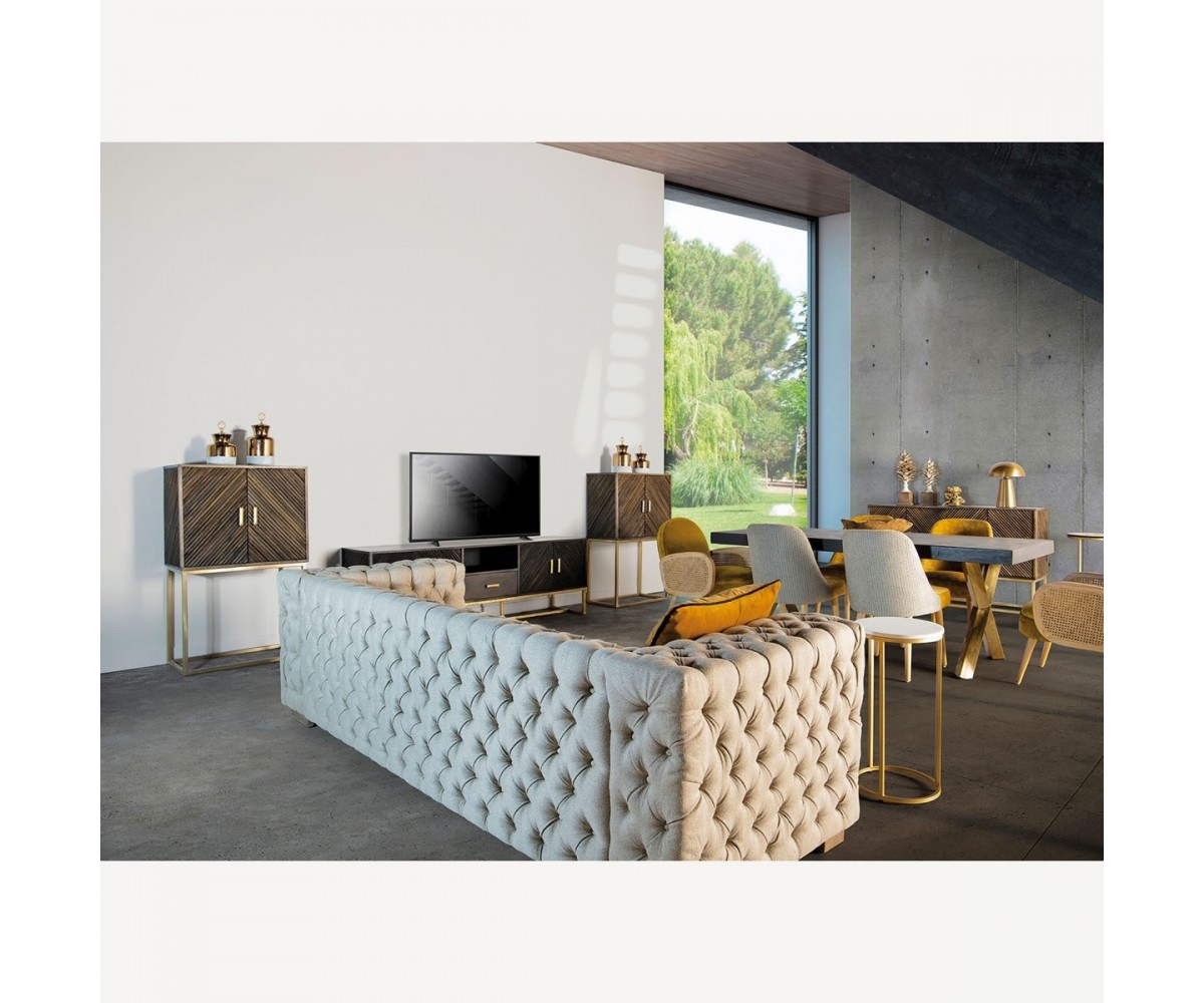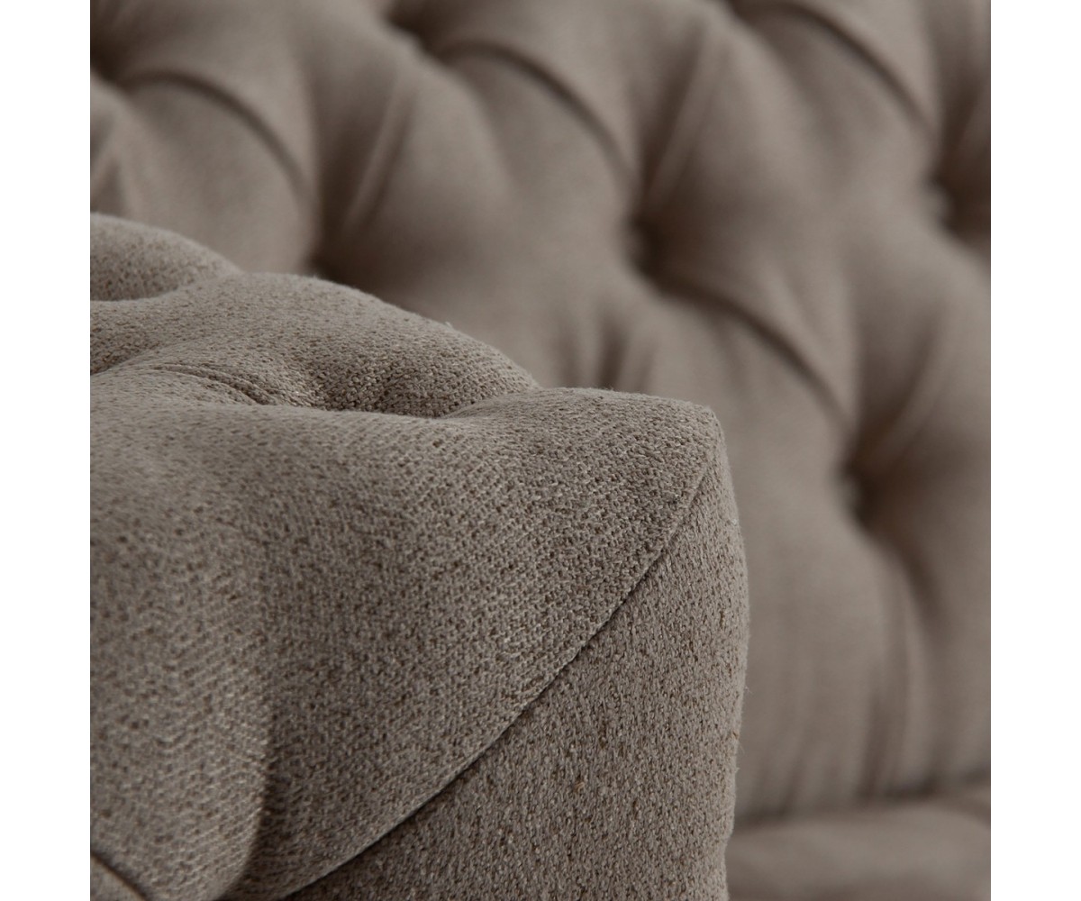 Sofá inspirado en un diseño de Paola Navone. Estructura de madera de abeto macizo de una pieza, relleno de polipropileno indeformable. Tapizado en tejido color crema. Producto desmontable. Patas en madera de nogal.