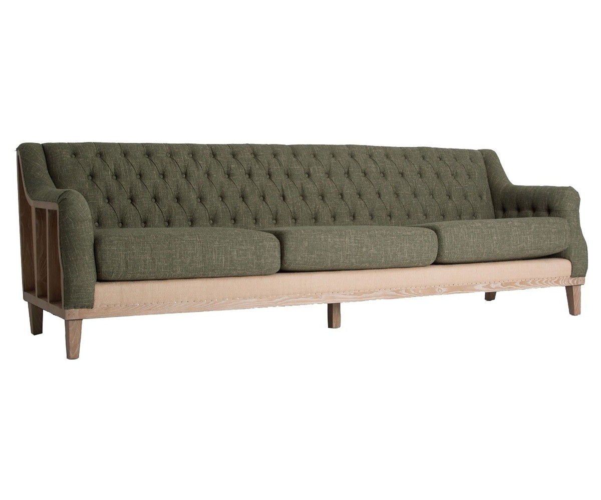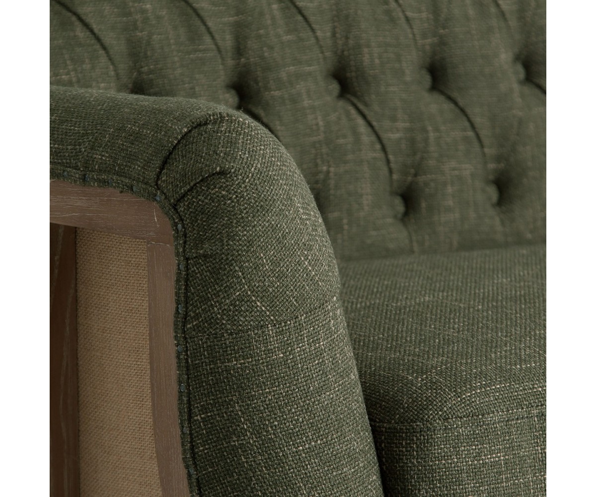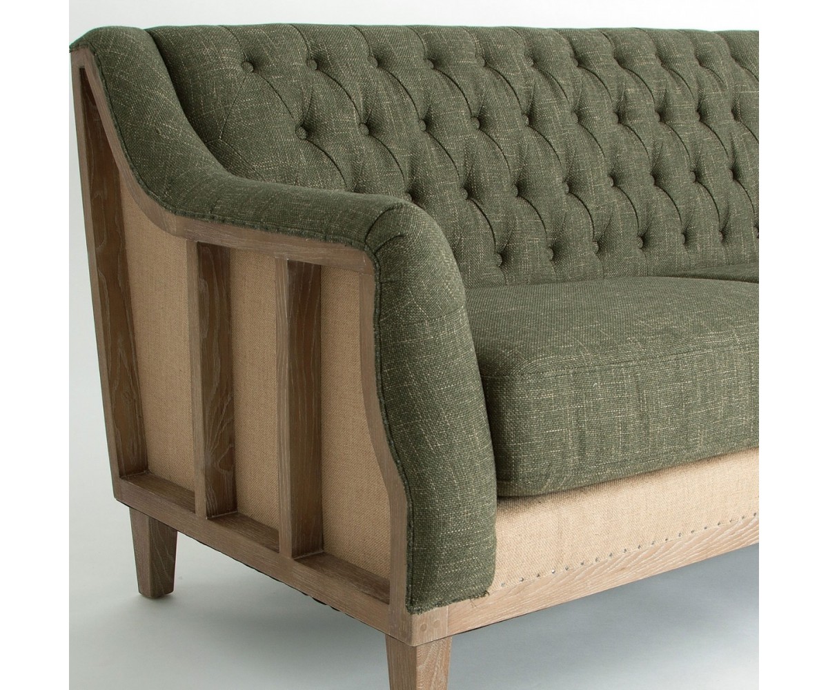 Sofá años 50, inspirado en un diseño de Eichholtz. Estructura de roble macizo de una pieza, relleno de polipropileno indeformable. Tapizado en tejido color verde 100% poliéster, combinado en loneta y yute. Producto desmontable. Patas en acero cónico en negro y dorado.