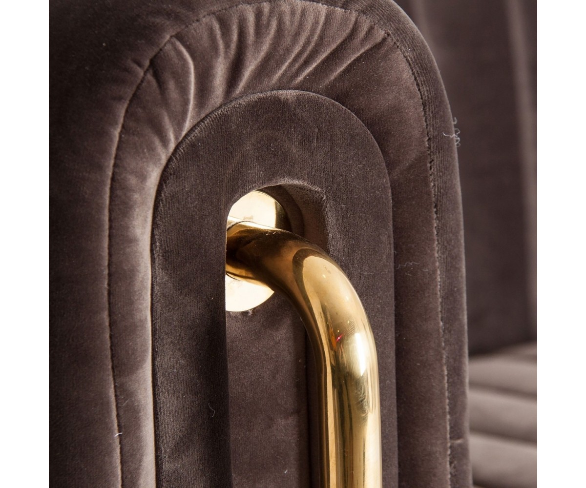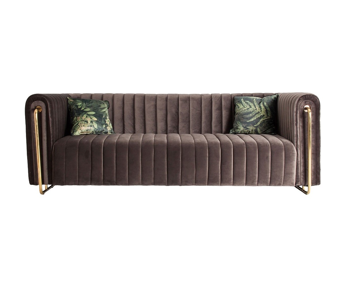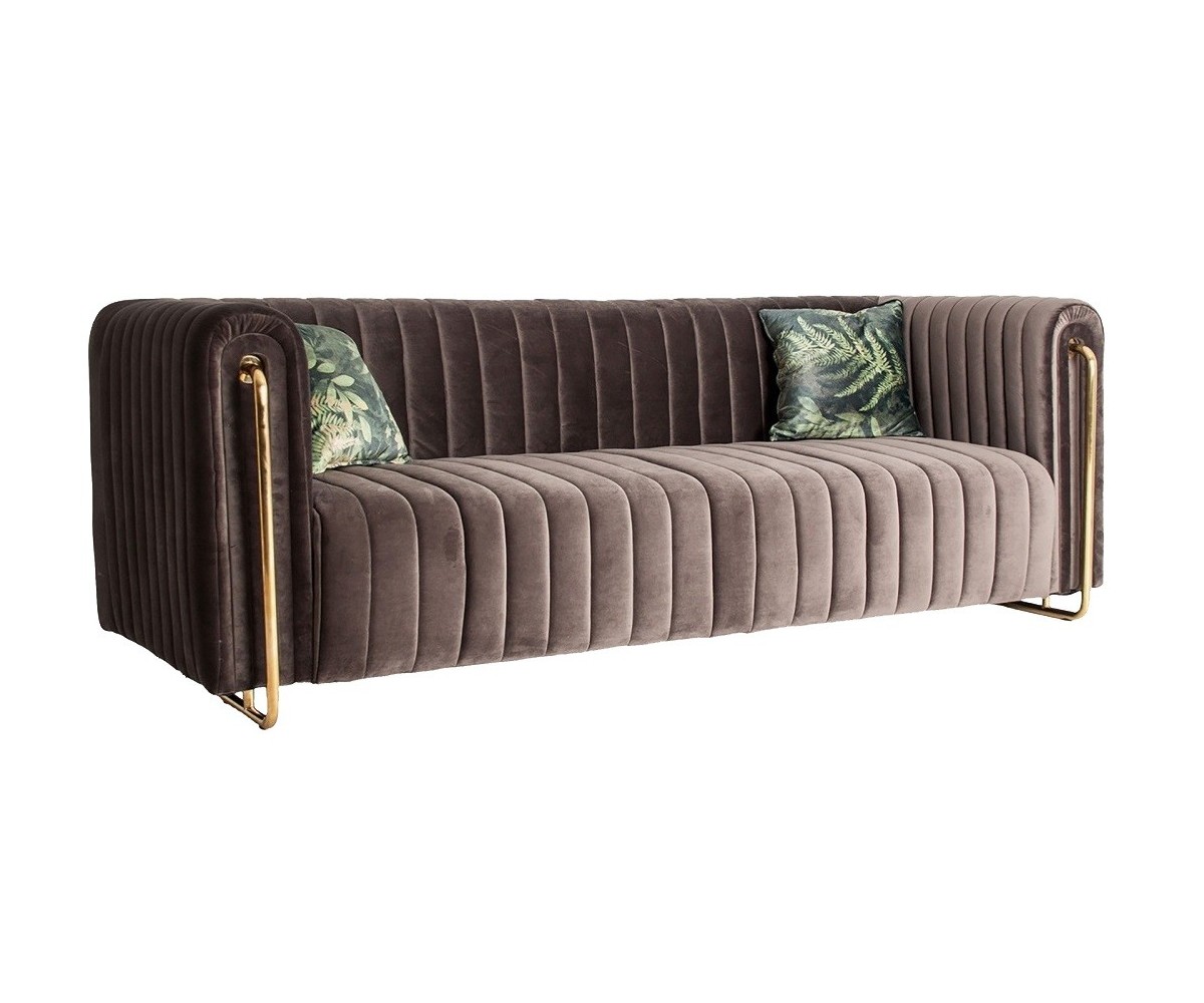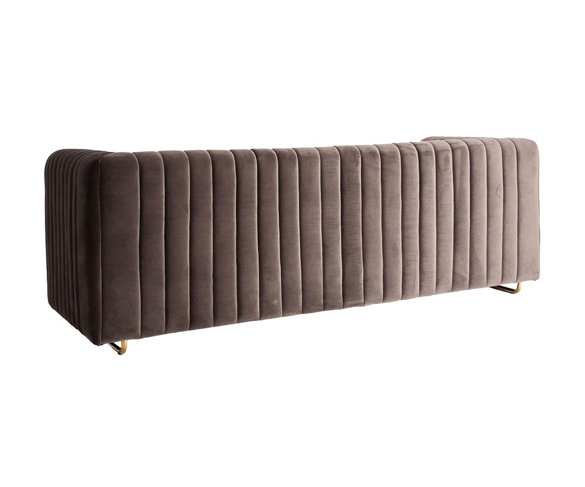 Sofá inspirado en un diseño de Sam Rivers. Estructura de roble macizo de una pieza, relleno de polipropileno indeformable. Tapizado en tejido color gris 100% poliéster, terciopelo, combinado con acero dorado. Producto desmontable. Patas en acero cónico en negro y dorado.