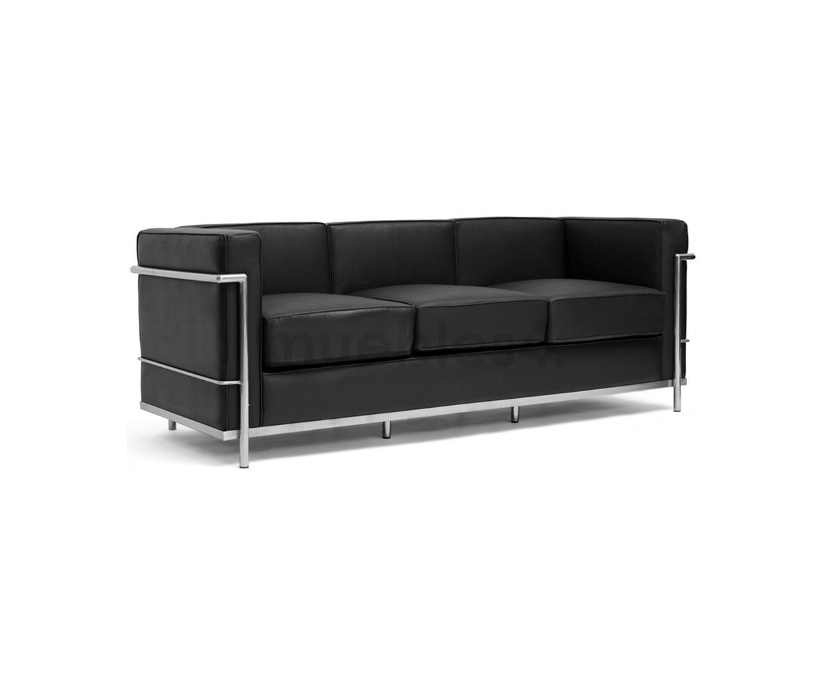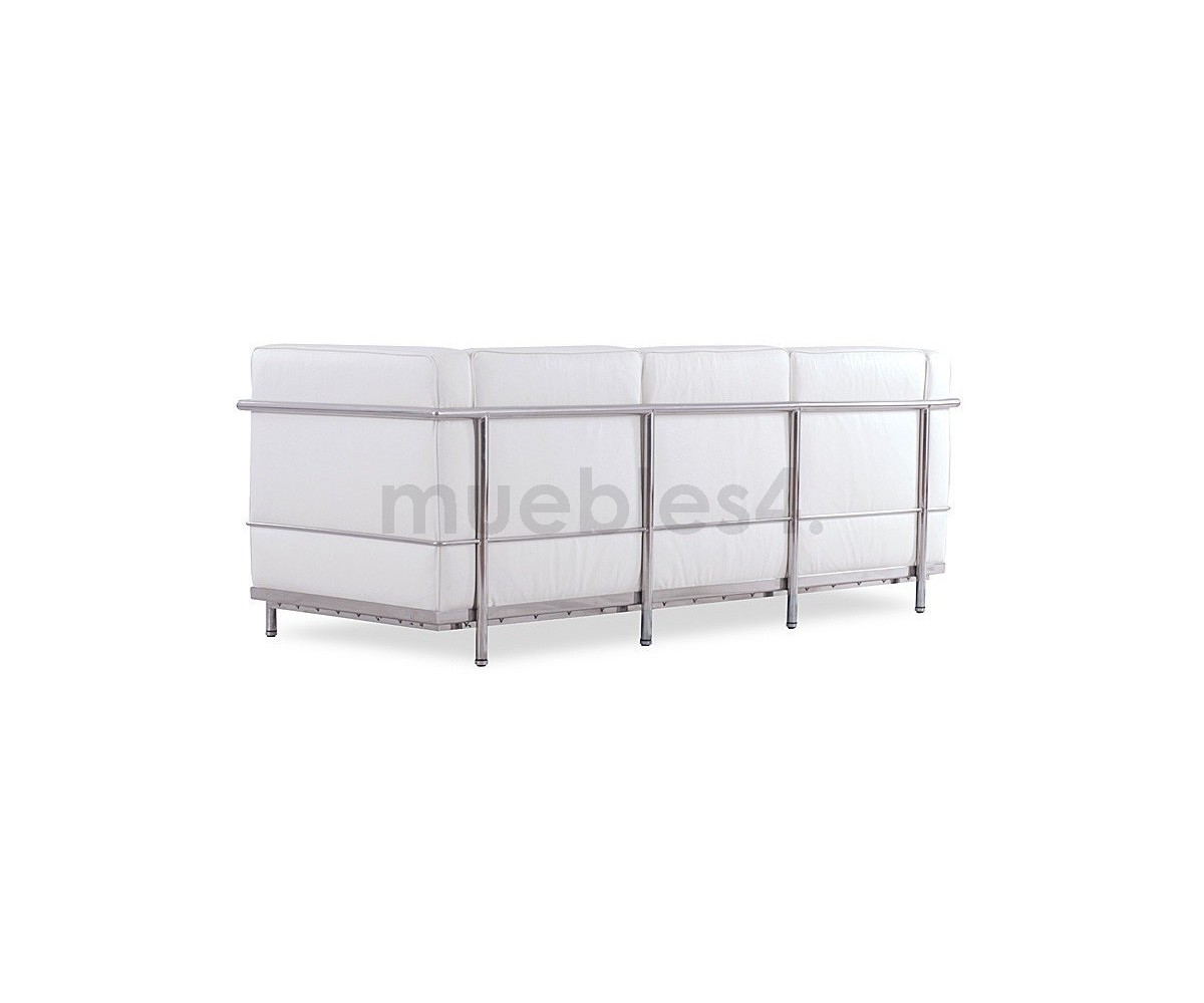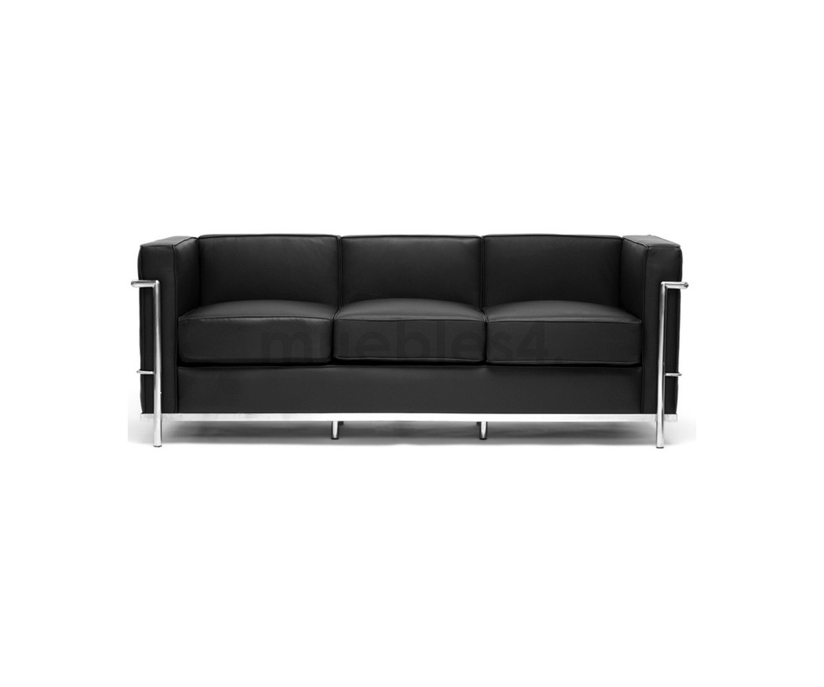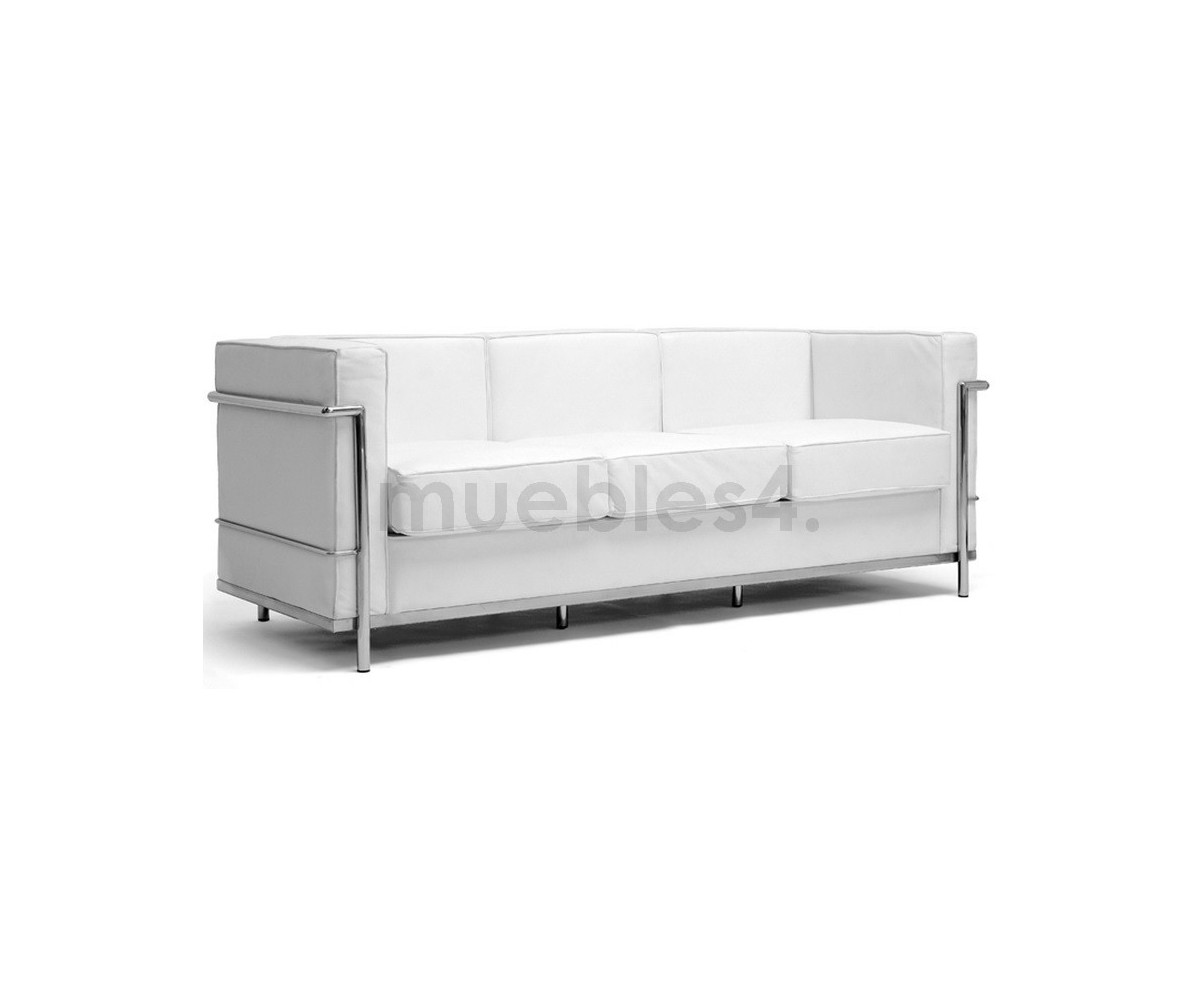 Sofá de 3 plazas inspirado en un diseño de Le Corbusier. Armazón inferior en acero cromado terinación brillo, laterales en acero tubular cromado terminación brillo. Asento, respaldo y apoyabrazos fabricado con espuma de polipropileno de alta densidad indeformable, tapizado en piel ecológica color negro o blanco. Réplica exacta con materiales originales de máxima calidad.