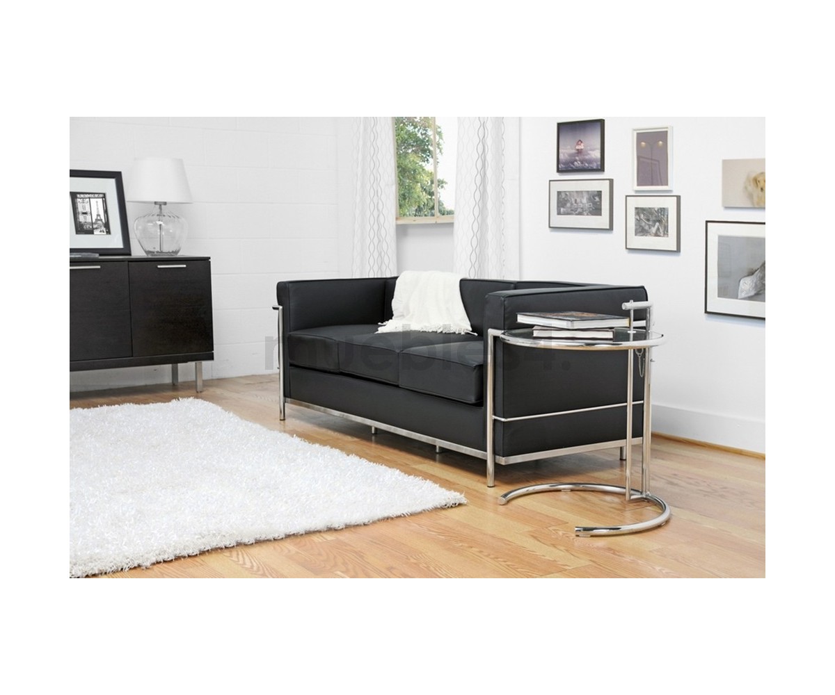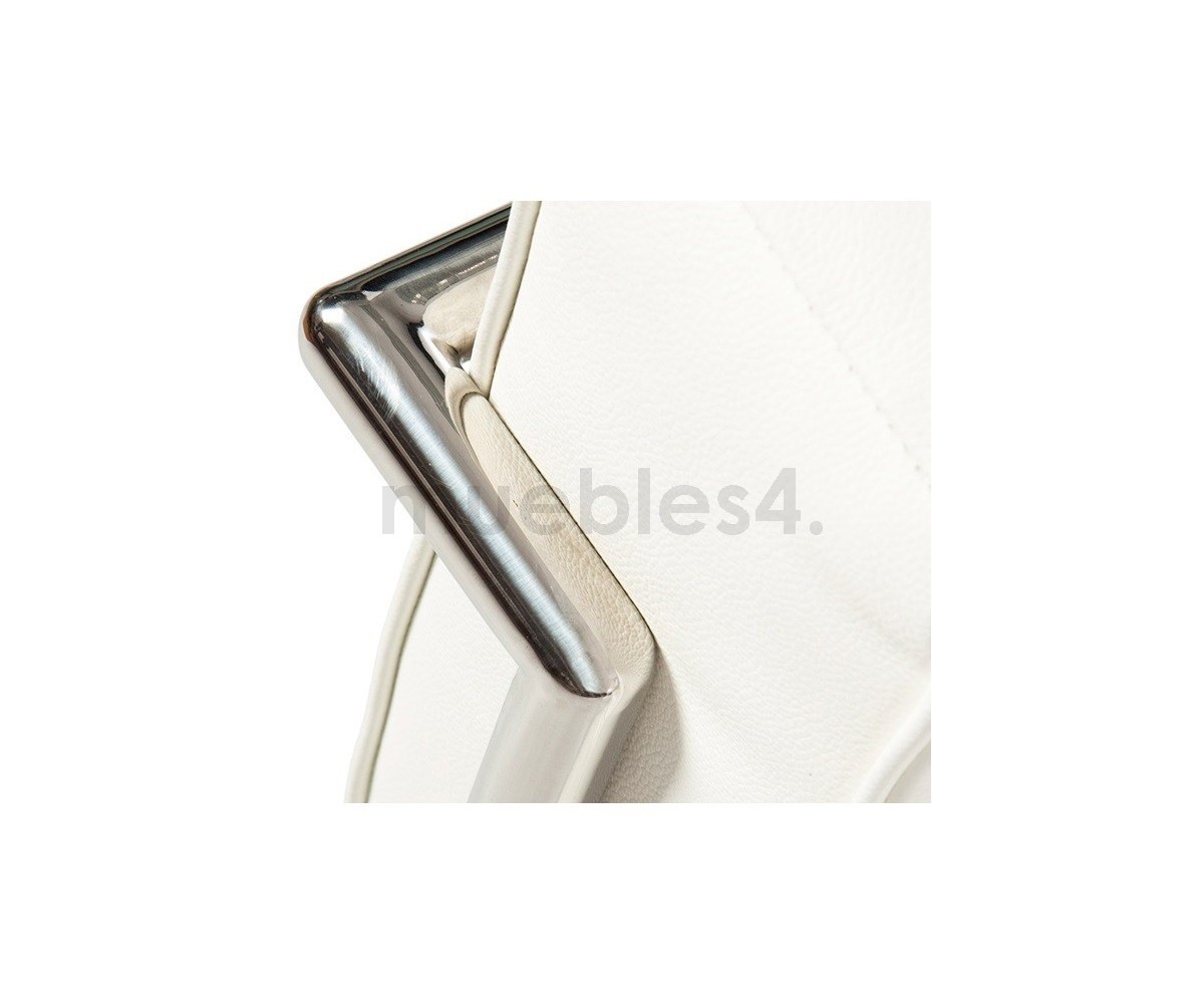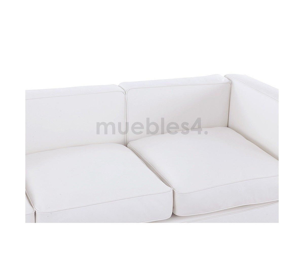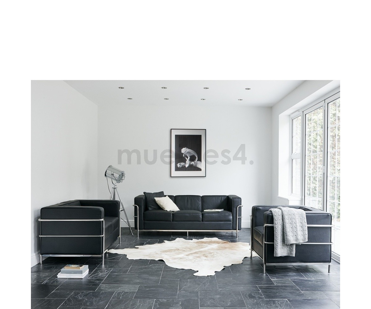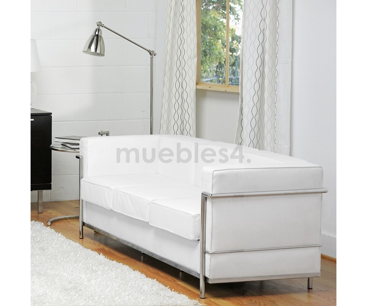 Sofá de 3 plazas inspirado en un diseño de Le Corbusier. Armazón inferior en acero cromado terinación brillo, laterales en acero tubular cromado terminación brillo. Asento, respaldo y apoyabrazos fabricado con espuma de polipropileno de alta densidad indeformable, tapizado en piel ecológica color negro o blanco. Réplica exacta con materiales originales de máxima calidad.