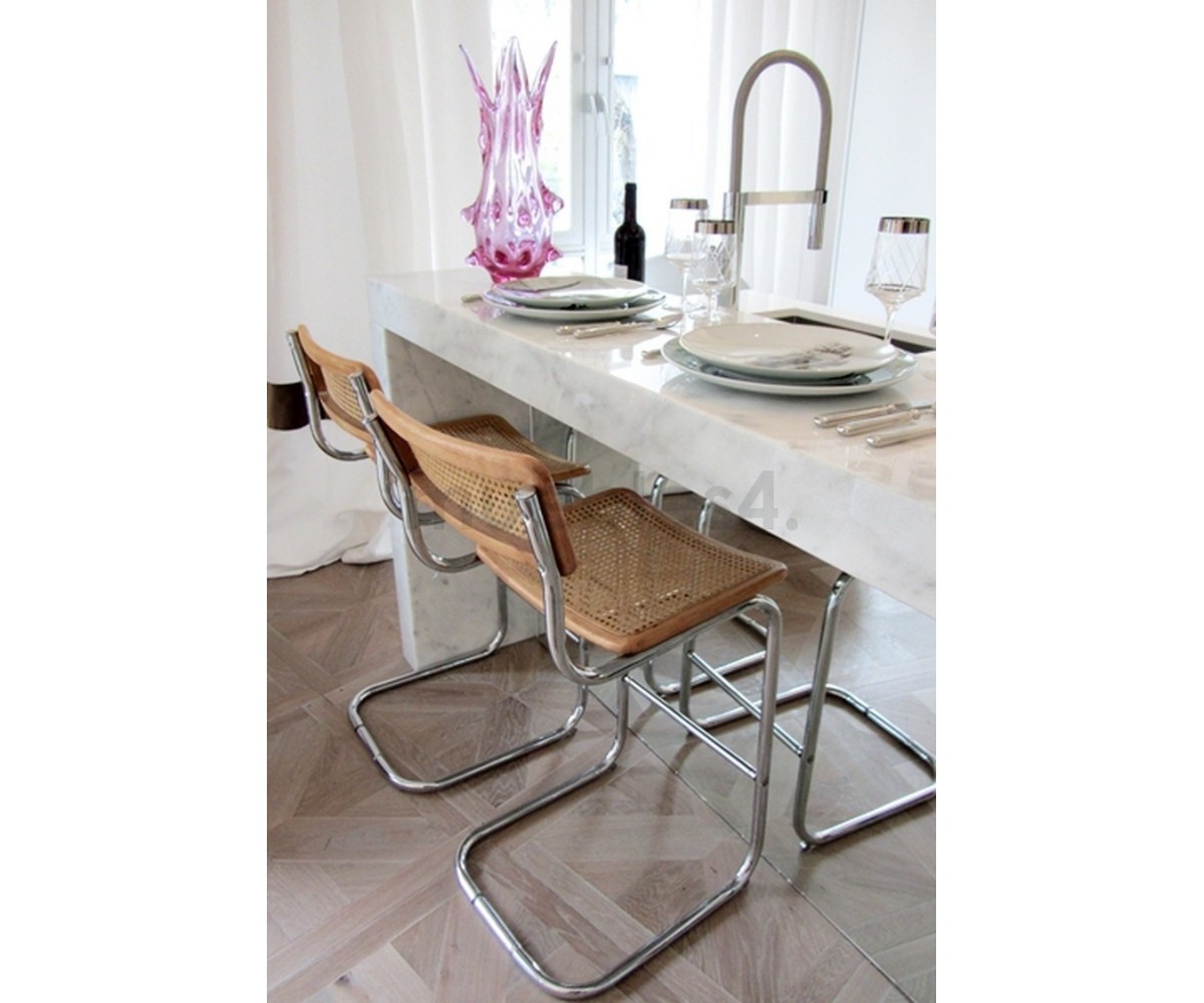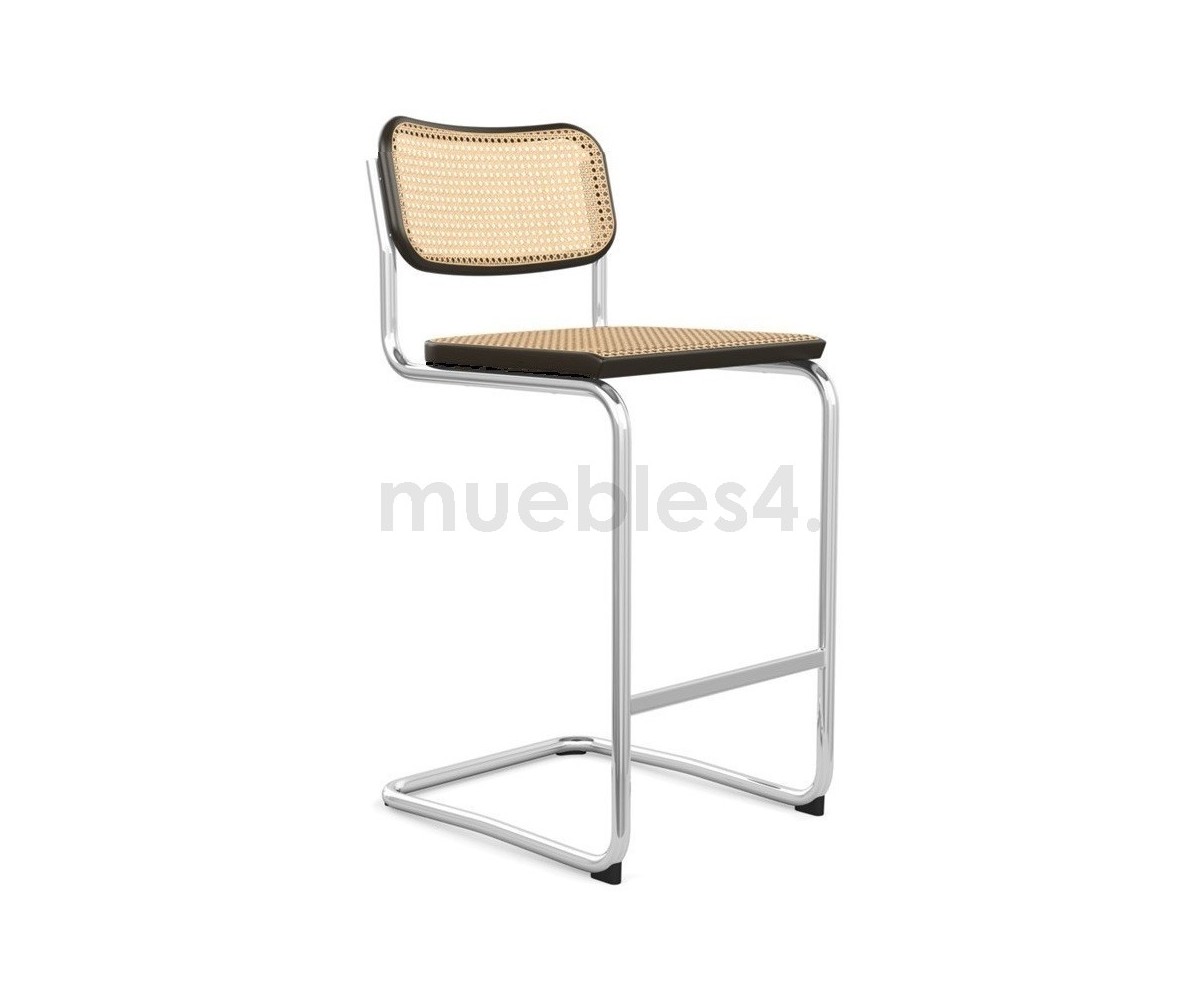 Taburete alto inspirado en un diseño de Marcel Breuer. Estructura tubular en acero inoxidable brillo, asiento y respaldo en madera con marco en roble claro natural o negra, caña natural. Réplica exacta con materiales originales de máxima calidad.