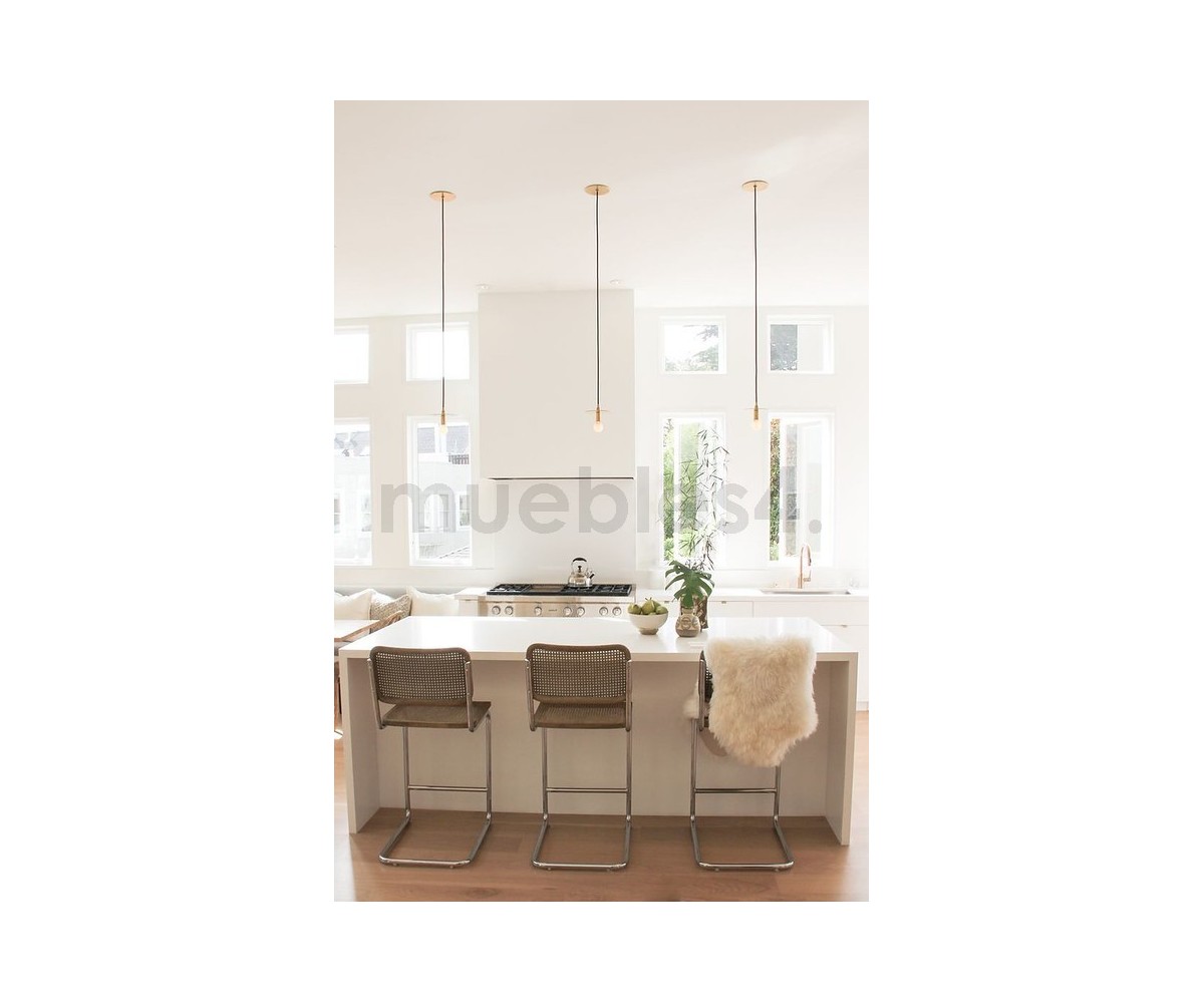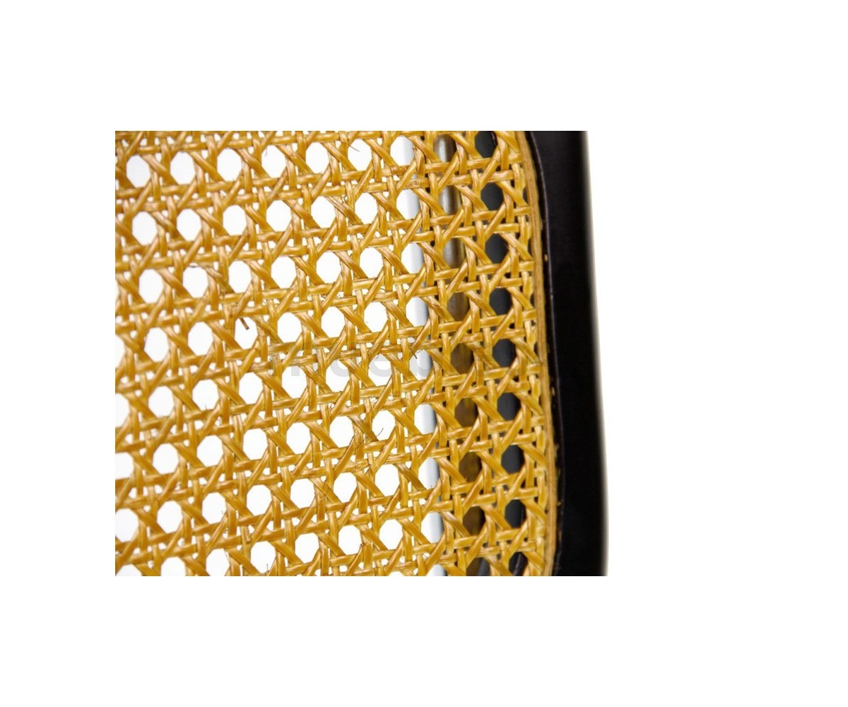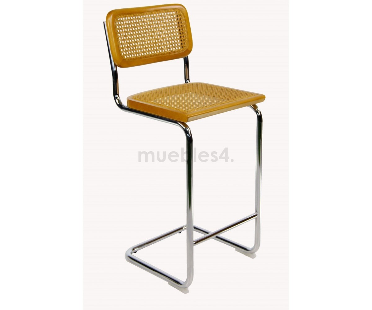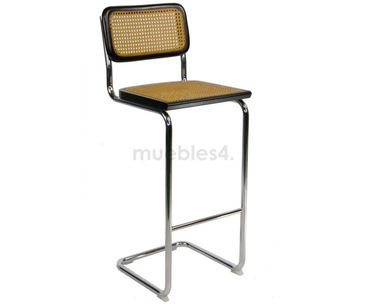 Taburete mediano inspirado en un diseño de Marcel Breuer. Estructura tubular en acero inoxidable brillo, asiento y respaldo en madera con marco en roble claro natural o negra, caña natural. Réplica exacta con materiales originales de máxima calidad.