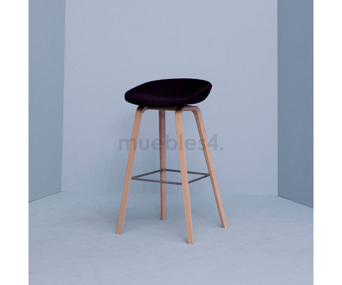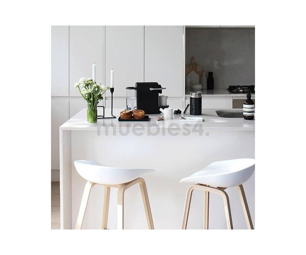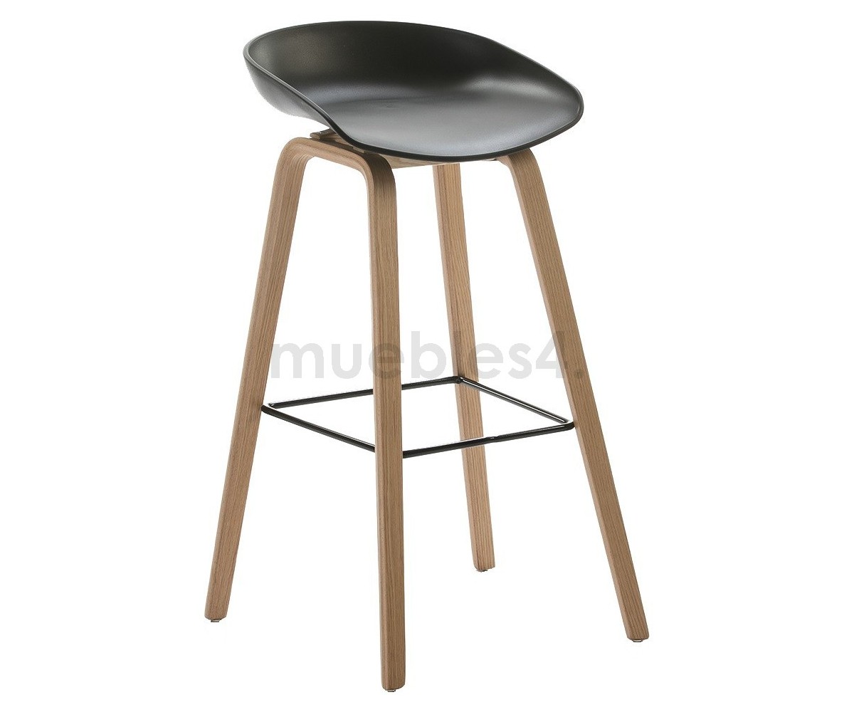Taburete alto, inspirado en un diseño de Hee Welling. Estructura fabricada en madera de roble macizo curvado con reposapies tubular con triple lacado en color negro y blanco. Asiento en fibra y acrílico de gran dureza en color negro o blanco. Réplica exacta con materiales originales de máxima calidad.
