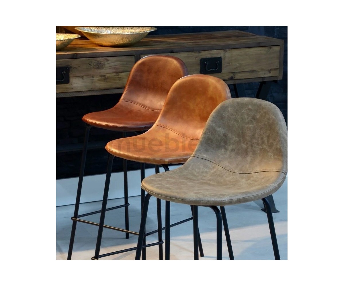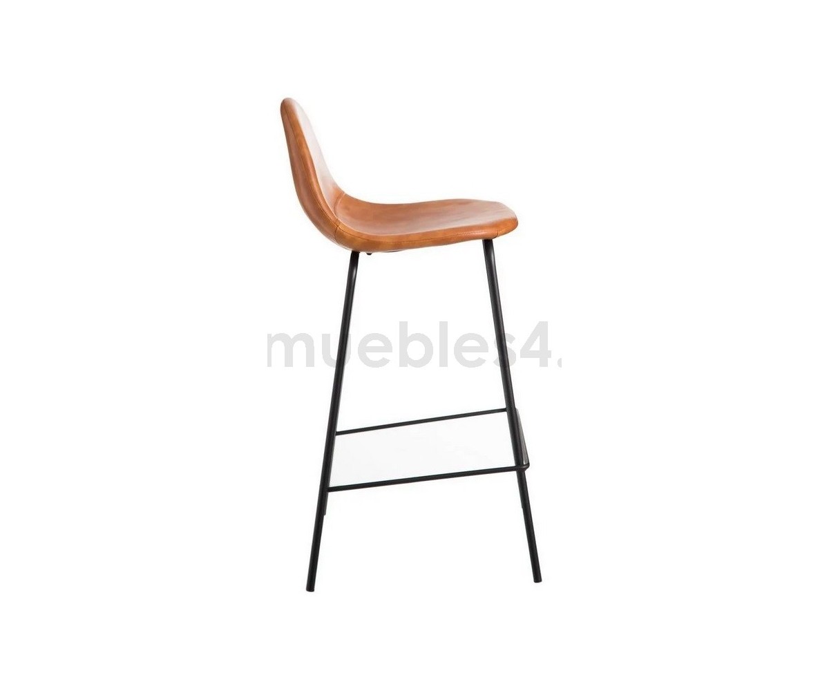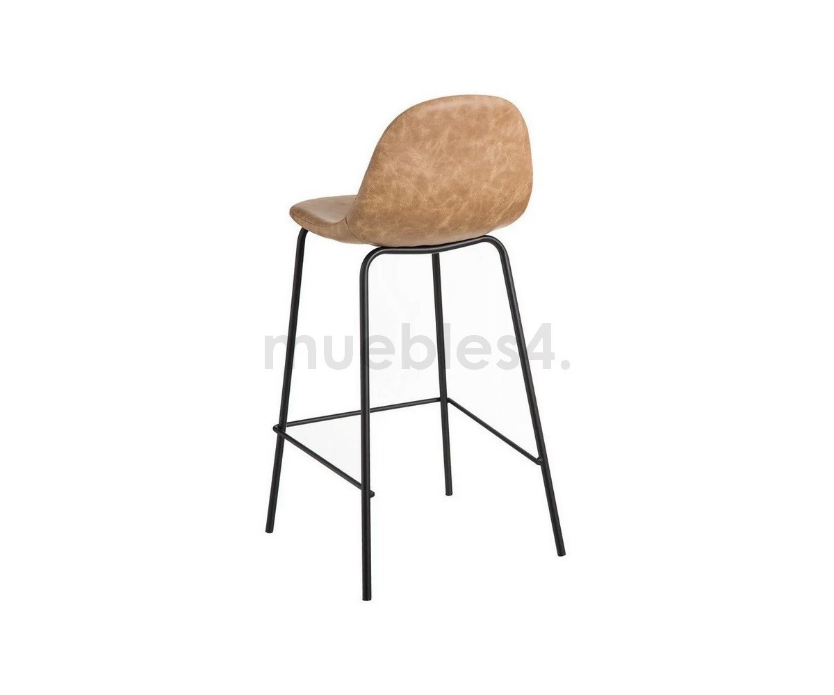Taburete alto inspirado en un diseño de Iskos-Berlin. Estructura fabricada en acero tubular con reposapiés lacado color negro, asiento en madera curvada tapizada en piel ecológica en color beig, marrón o granate, relleno de esponja de 10mm de espesor. Modelo no apilable. También disponible en silla. Réplica exacta con materiales originales de máxima calidad.
