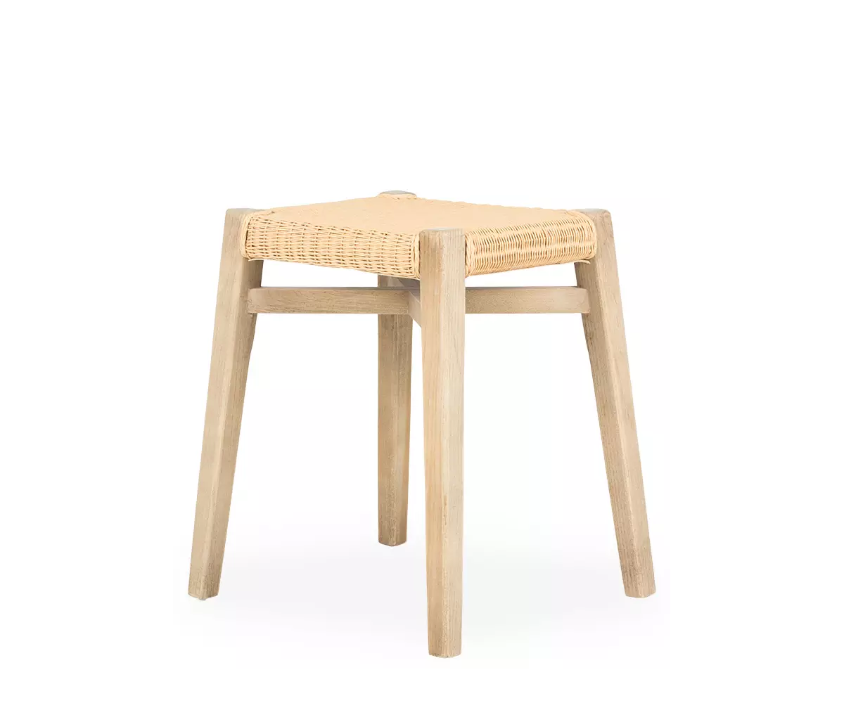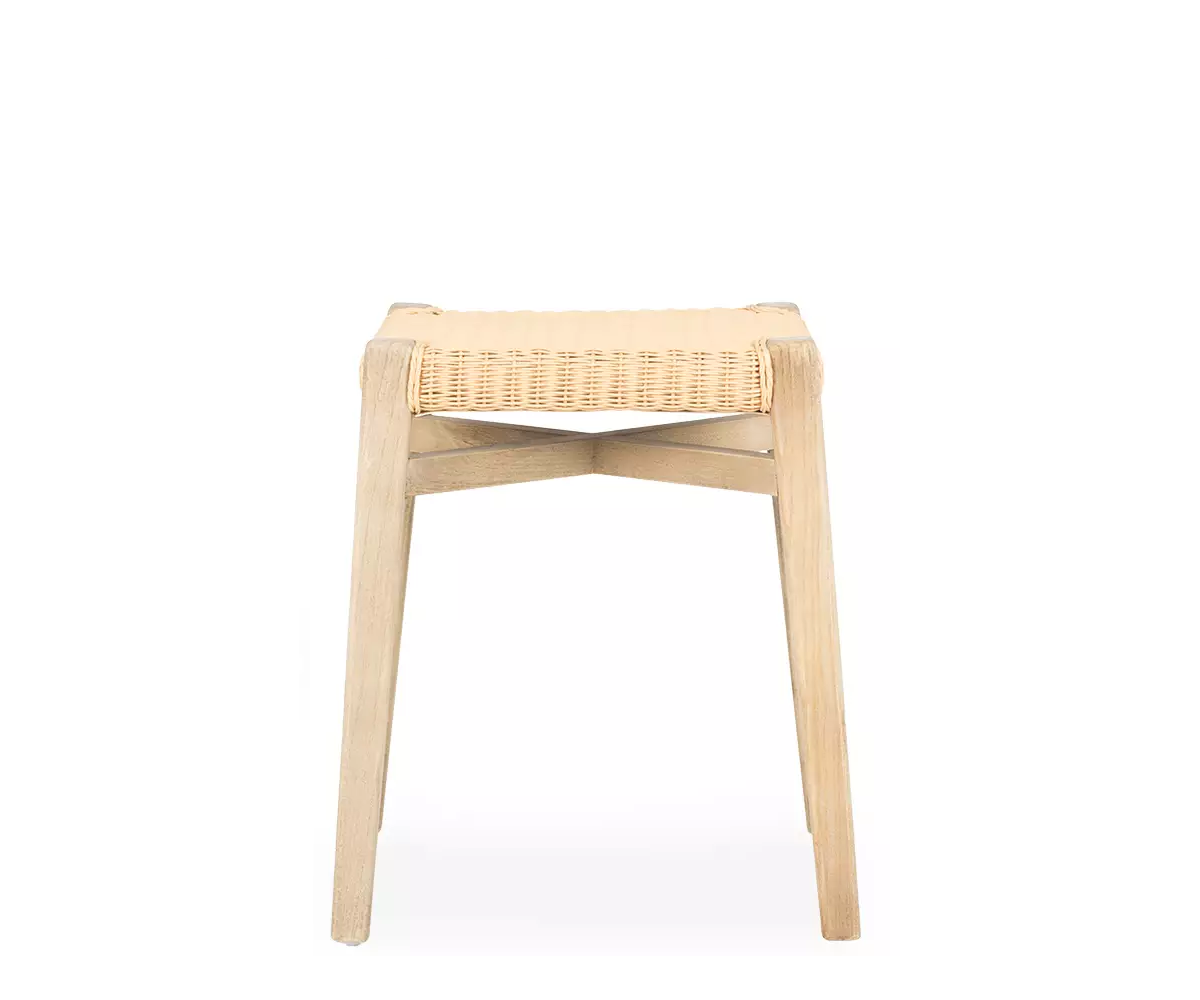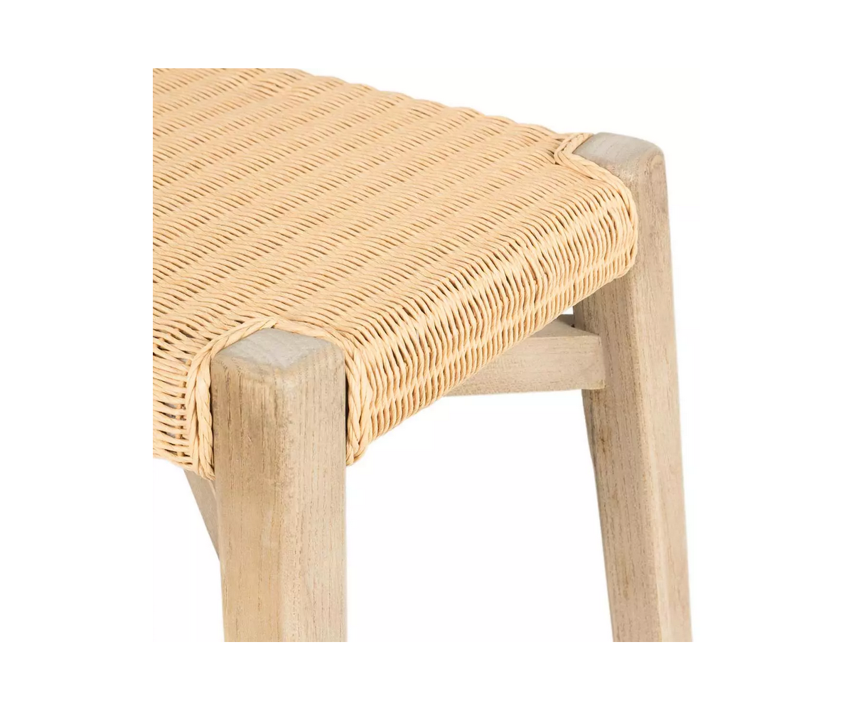 Taburete bajo de diseño nórdico, inspirado en un modelo de Ferdinand Kramer. Estructura en madera del olmo macizo color natural, asiento en cuerda de enea. Réplica con materiales originales de máxima calidad.