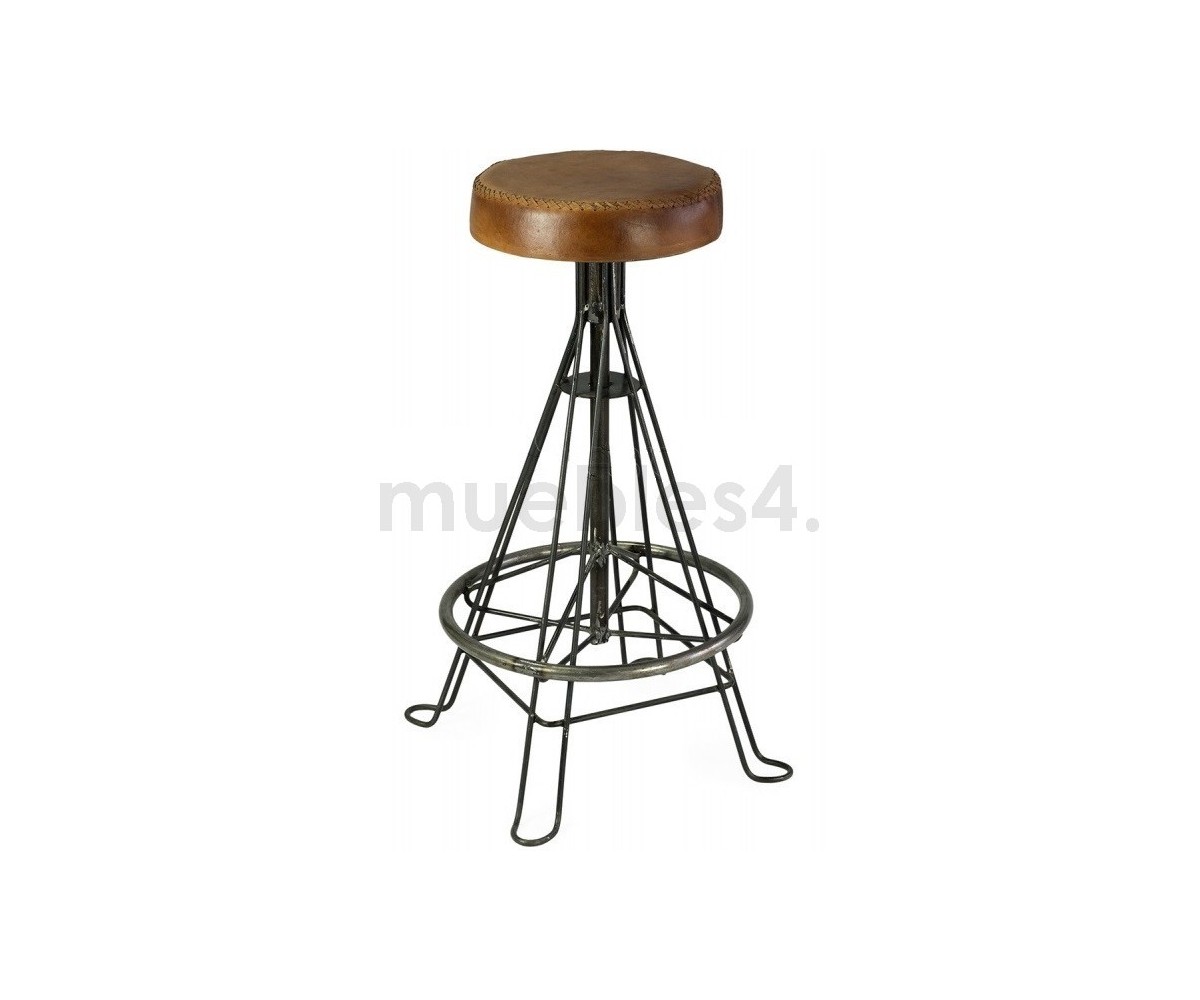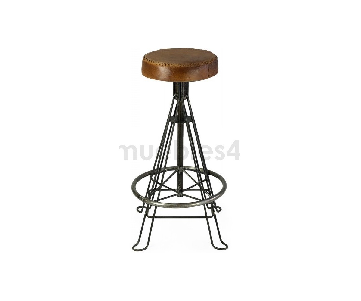 Taburete alto estilo vintage, estructura fabricada en acero terminación color negro, asiento circular acolchado y tapizado en piel marrón. Réplica exacta con materiales originales de máxima calidad.
